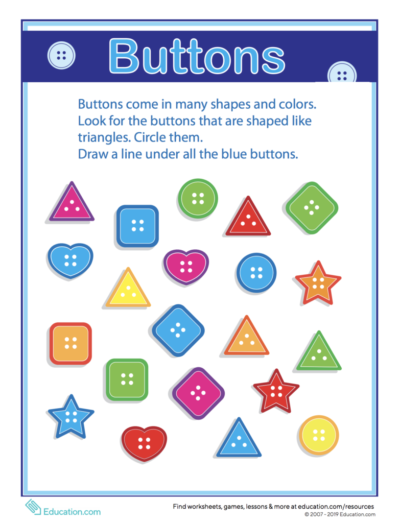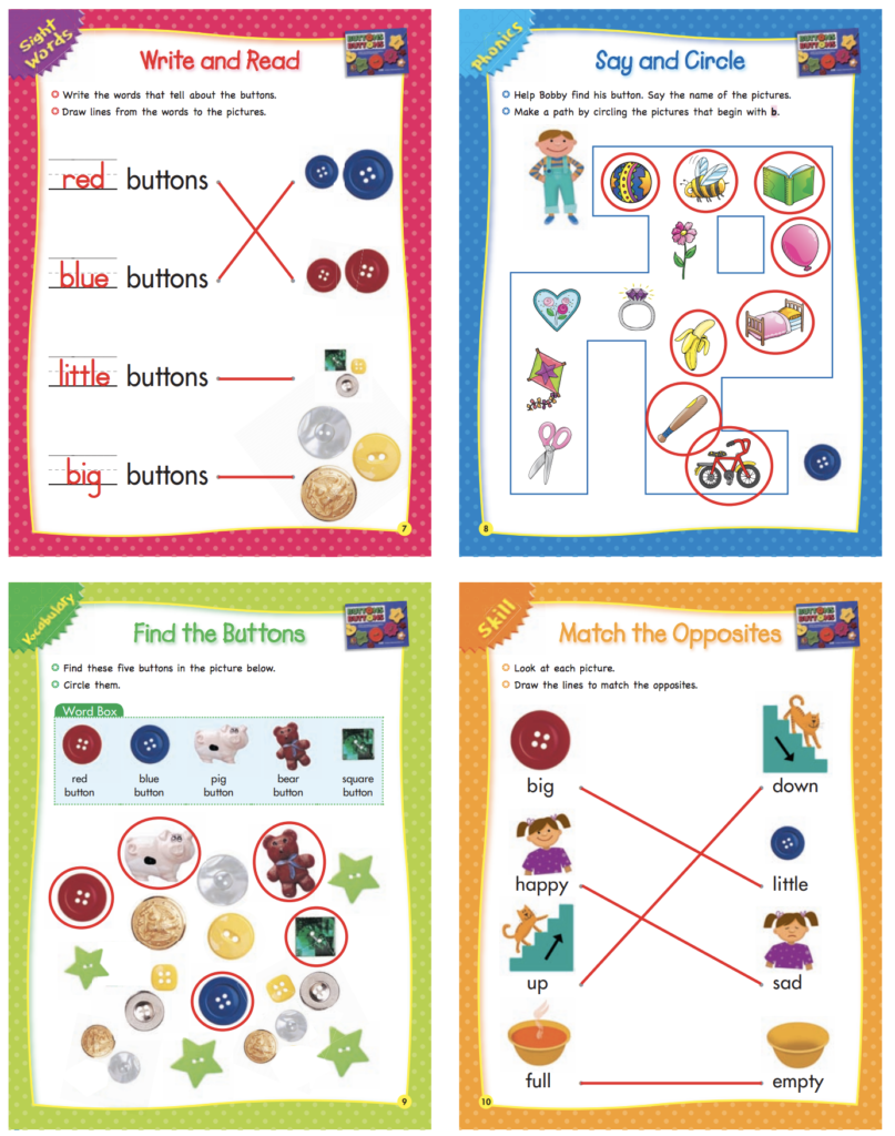 Vocaburary: red button, blue button, pig button, bear button, square button – Find the Buttons ボタンを探して丸で囲みましょう。