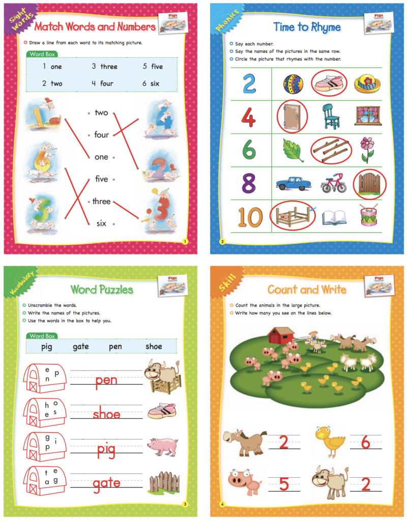 One〜Tenまでの数字がOne, two Pigs in a shoe. のように偶数の数字(two)と韻を踏む単語(shoe)が出てきます。数字だけでなく前置詞も学べます。
