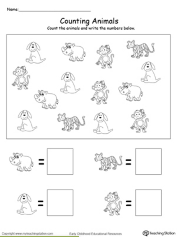 Dog(イヌ), Monkey(サル), Tiger(トラ), Rhino(サイ)の数を数えて四角の中に数字を書きましょう。